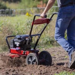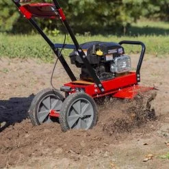 - Forged tines with multiple tilling widths and easy turn and transport wheels