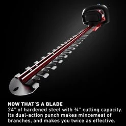 The Toro 60V max 24 in. hedge trimmer is two full feet of ferocious. Its powerful 60-volt motor cuts through branches like butter. Our exclusive blade design funnels branches in and keeps them there until they’re sliced, diced and done. And its dual-action cutting bar makes you twice as effective. Need to switch from horizontal to vertical trimming.